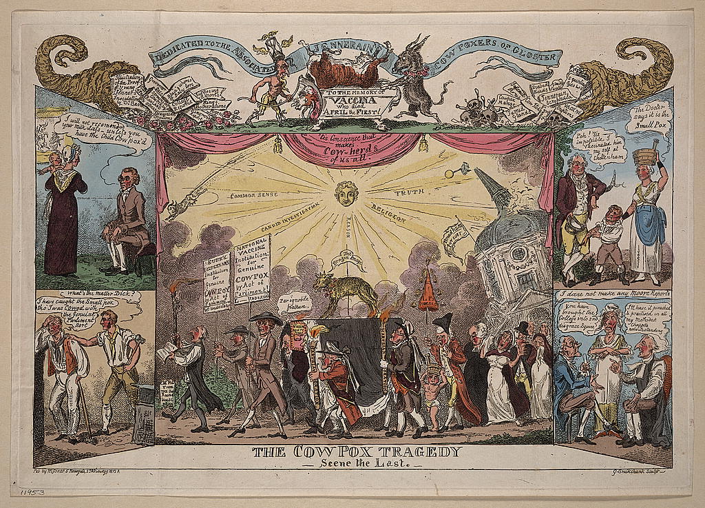 A teenage girl in the Netherlands recently developed cowpox, the viral cousin of smallpox, after trying to save a drowning kitten. Within a week of her contact with the kitten, the girl had developed a large necrotic ulcer on her wrist. Cowpox being as rare as it is, by the time doctors correctly diagnosed her, the infection had begun to clear up on its own (it’s naturally self-limiting). Cowpox is famous for being used by Edward Jenner in the first effective vaccine, against the now eradicated smallpox virus. As the above image shows, there was significant resistance on the part of the local population to intentionally infecting themselves with the harmless cowpox virus. To prove the vaccine’s safety and efficacy,  in 1796 Jenner rather dubiously inoculated an eight year old boy with the cowpox virus before infecting him with smallpox. When the boy was shown to be immune to the deadly virus, the concept of vaccination was born.