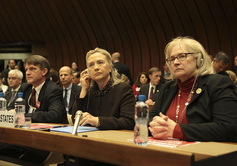 (Image: Secretary of State Hillary Rodham Clinton listens to the discussion at the 7th Review Conference of the Biological and Toxin Weapons Convention. Also at the U.S. Delegation desk are Ambassador Laura E. Kennedy, U.S. Special Representative for Biological and Toxin Weapons Convention Issues and Representative to the Conference on Disarmament and Thomas Countryman, Assistant Secretary of State for International Security and Nonproliferation.)