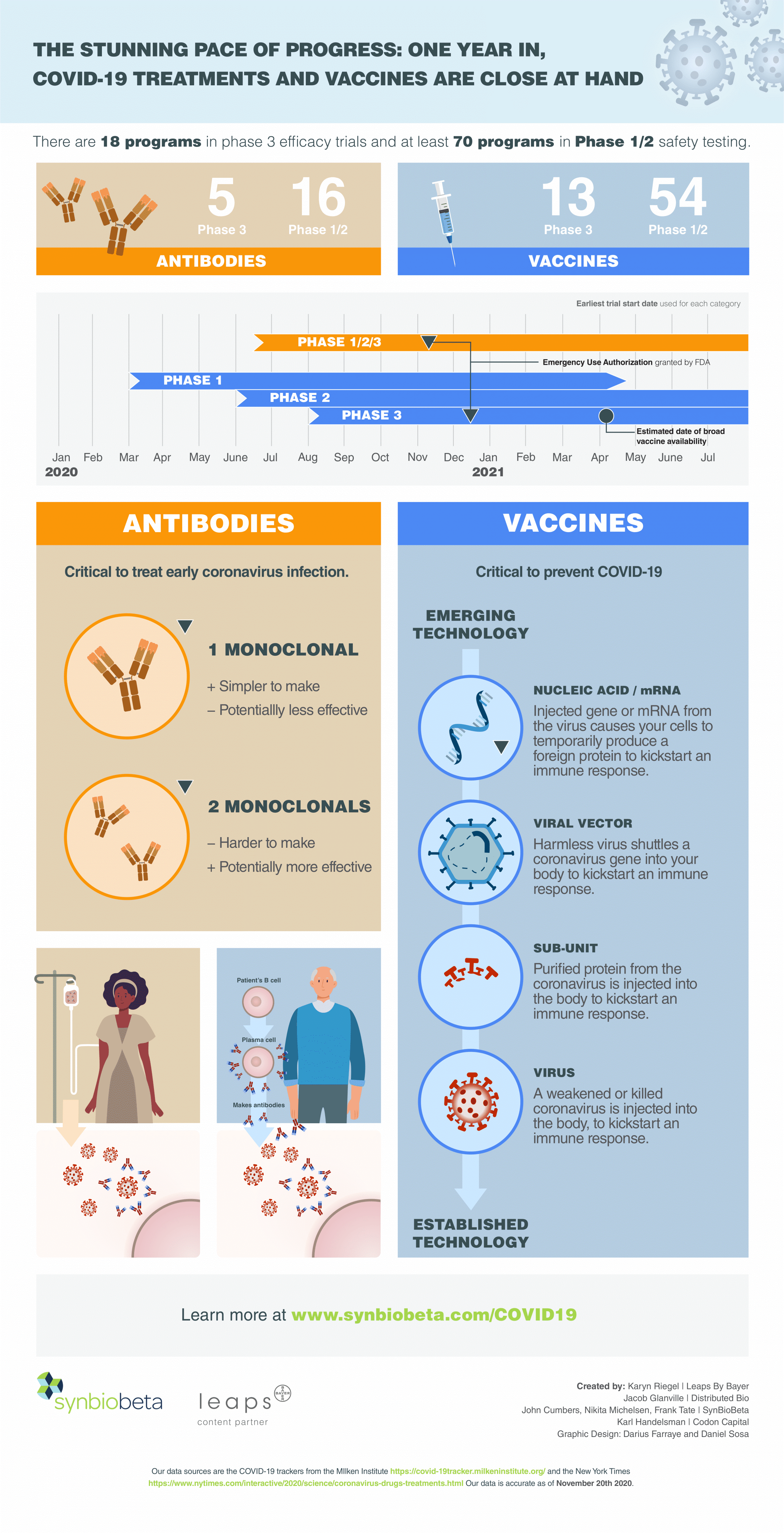 SynBioBeta – an innovation network for biological engineers, investors, innovators and entrepreneurs – released a clever infographic summarizing the pace of progress in COVID-19 treatments and vaccines.