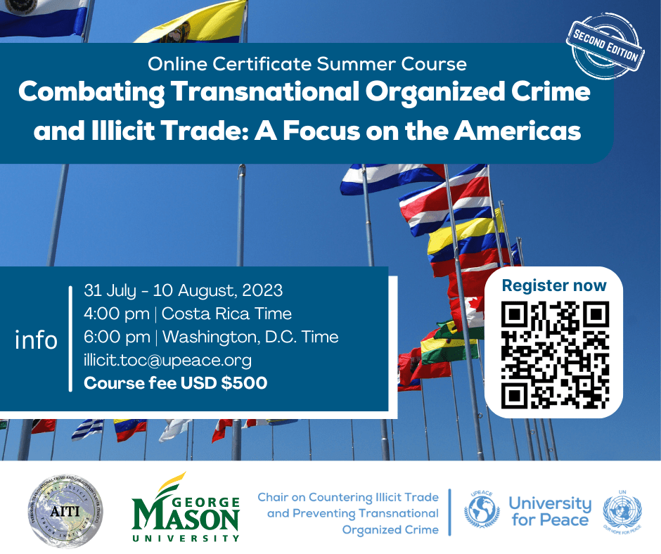 “The University for Peace (UPEACE), the Terrorism, Transnational Crime and Corruption Center (TraCCC) at the George Mason University, and the Anti-Illicit Trade Institute (AITI) are pleased to offer the second edition of the online Summer Certificate Course on Combating Transnational Organized Crime and Illicit Trade: A Focus on the Americas.”