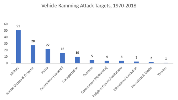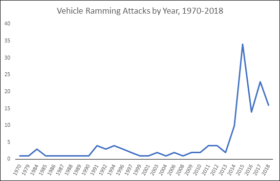 In this article, the term “vehicle ramming attacks” (hereafter, VRAs) encompasses any terrorist attack that utilizes the kinetic force of a vehicle to strike its target. This excludes vehicle-borne explosive devices. Some data sets use a broader definition of “vehicle” than I will use here. For example, the University of Maryland Global Terrorism Database considers the September 11th attacks an example of a VRA because the kinetic force of an airplane was used against several targets. This article examines attacks with land vehicles, such as cars, trucks, tractors, and buses, in order to understand how extremists with limited means can still perpetrate a devastating attack with relatively few resources.
