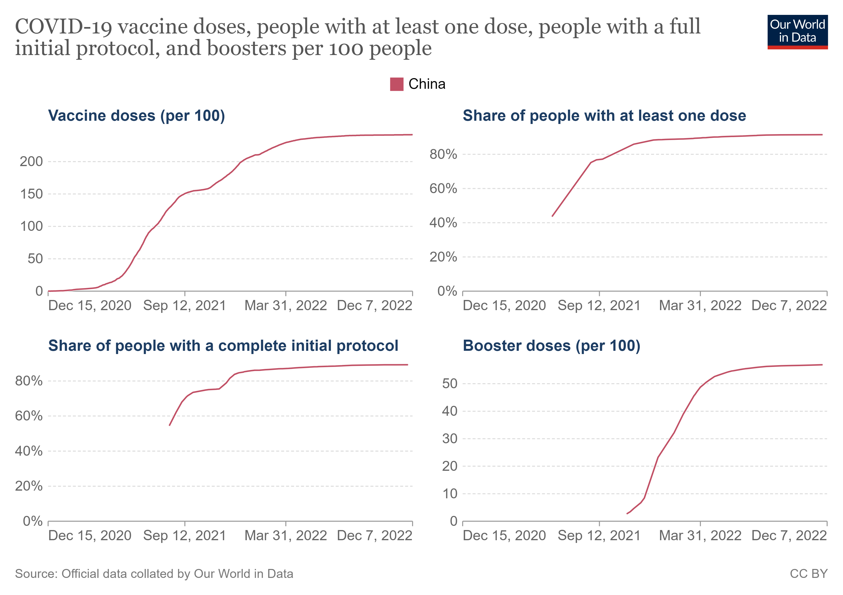 In terms of the economic consequences of this rollback, China, the world’s second largest economy, is staring down what will probably be the world’s biggest COVID-19 surge ever. The last few years saw China’s frequent lockdowns cause an economic slowdown that had global impacts. China’s 2Q GDP growth slowed to .4% this year, in large part because of the constant lockdowns. This certainly hampered national objectives and created global problems in a world economy already bogged down by inflation, energy crises, and food supply disruptions–and that was when case counts were much lower than they are right now. In major financial centers like Hong Kong, the harsh COVID-19 policies has fueled an exodus of the business community as expats seek to escape the restrictions (though, of course, the National Security Law and changes in Hong Kong’s governance structure also fueled this in recent years). The switch to rolling back Zero-COVID, then, seems like a good step in reopening and growing China’s economy but, again, that is unlikely to work in the absence of widespread, effective vaccination efforts and other long-term mitigation strategies.