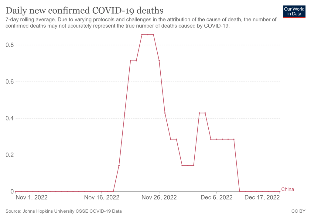 Furthermore, while the PRC has not reported any COVID-19 deaths since December 4, reports of untallied COVID-19 deaths continue to grow. For example, staff at the Dongjiao Funeral Home in Beijing claim to be receiving the bodies of COVID-19 victims, numbering as high as 30-40 per day, with those who died of COVID-19 being prioritized for cremation. Body bags have also been observed being taken from COVID-19-specific hospitals in the country, casting further doubt. Throughout this pandemic, China’s COVID-19 case and death counts have been called into question repeatedly. Now, with the population left largely unprotected, it seems even more unlikely that there are not more cases and deaths than the government is letting on. Furthermore, the government announced last week that it would stop reporting asymptomatic infections, which have historically been the bulk of positive test results in the country. This represents yet another potentially critical reduction in data sharing and risk communication. Finally, even if this current wave is fueled by transmission that predates the policy rollbacks, how could deaths be so low, all things considered? This question is fueling concerns that Beijing is concealing important data on this outbreak.