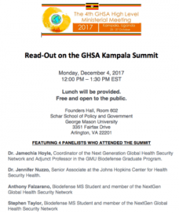 Global health security on your lunch break? Only at the Read-Out on the GHSA Summit will you get lunch and an in-depth recap of this international health security event. Don’t miss this exciting opportunity to hear from global health practioners and young professionals who attended the 4th annual Global Health Security Agenda (GHSA) Ministerial Meeting in Kampala, Uganda in October. You’ll want to register ASAP for this exciting opportunity on December 4th, from 12-1:30pm at the George Mason University Founders Halls in Arlington. The GHSA meeting, Health Security for All: Engaging Communities, Non-governmental Organizations, and the Private Sector, was a multi-sectoral collaboration between governments, civil society, and industry dedicated to the strengthening of globaly capacity to prevent, detect, and respond to infectious disease threats. Attended by the ministers of health, finance, and agriculture and other senior officialfs from more than 50 nations, this was the first Ministerial GHSA Meeting held on the African continent. The meeting was held in late October at the same time as an unprecedented outbreak of pneumonnic plague in Madagascar and a rare outbreak of Marburg in Uganda itself. These outbreaks were timely, but unfortunate reminders, that global health security is still very much a work in progress. Our panel will include four participants who were on the ground in Kampala and actively engaged in this historical step forward for global health security. Attendees will have the opportunity to engage and hear the perspectives of esteemed public health practitioners and rising health security professionals. Lunch will also be provided. This event is free and open to the public.