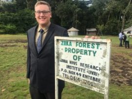 The George Mason University 3-Minute Thesis competition took place this past weekend and we’d like to congratulate Biodefense PhD student Chris Brown on his participation in this exciting event! He was one of ten finalists who competed to explain their dissertation to a non-specialist audience in 3 minutes. Chris described his dissertation regarding protecting critical workers against emerging infectious diseases – “Many different types of workers, including those who provide essential services the rest of us frequently depend on, are at risk of exposure to emerging infectious diseases that spread through the general population. Although many factors play into these types of workers being exposed on the job, protective gear—equipment like gloves, gowns, goggles, and respirators—is an essential part of infection prevention programs aimed at keeping workers healthy. During recent outbreaks, the public health enterprise has tended toward reinventing guidelines for each new infectious disease we face. That can lead to confusion about what guidelines for worker protection should be followed, as well as delays in implementing protective measures as science works to understand the disease agent and its transmission mechanisms. Pivoting toward a system based on worker exposures associated with various job tasks instead of one built around accurately characterizing transmission routes, my research offers a guideline for protective gear that is applicable to a wide range of diseases and that can be used as soon as outbreaks begin. It serves as an off-the-shelf solution for worker protection until empirical evidence supports using disease-specific infection prevention practices.”